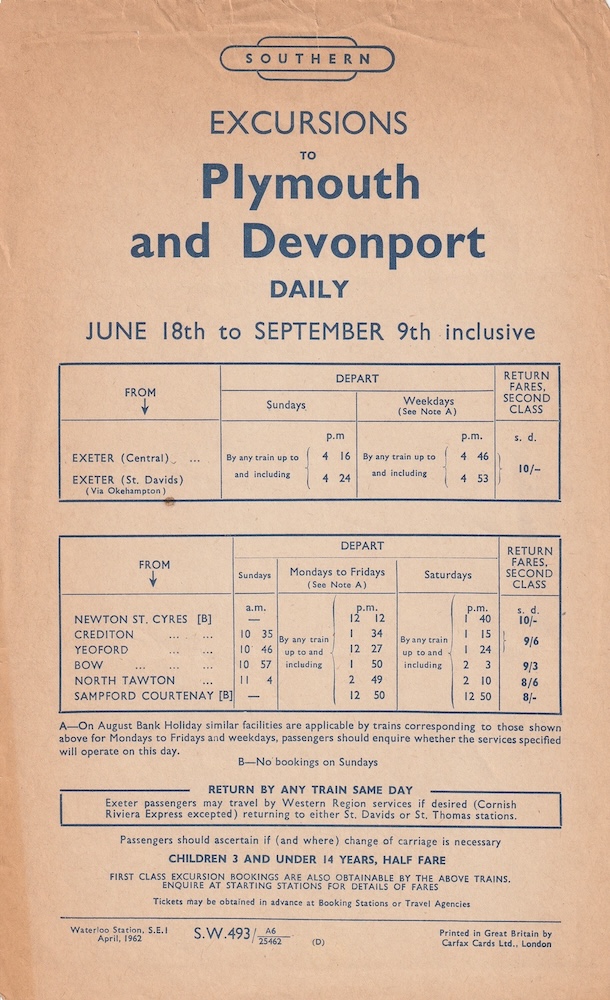 | Handbill, April 1962. Cheap excursion fares to Plymouth and Devonport. Another later version. | |