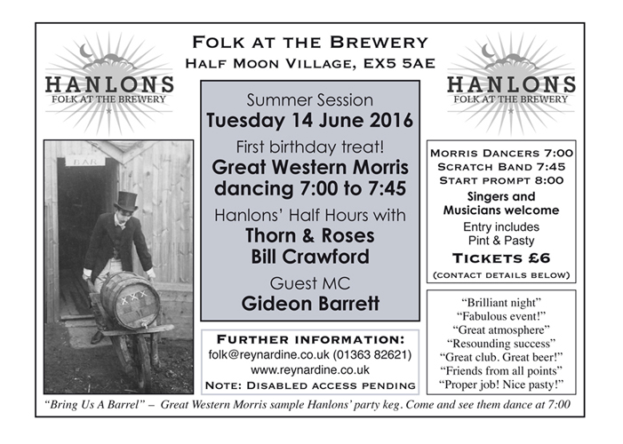 "This was my first trip to the sessions at Hanlons. I thought it was a superb evening and a very refreshing change to the usual folk club. I think you are right to make it an occasional event. It keeps it special and allows that 'gathering of the tribes' feeling. I particularly liked the idea of a guest craft exhibitor. The chorus singing was stupendous. My companion had come to watch the Morris and had not been to a folk club before. What an introduction! My only suggestion would be a little more time for socialisation; perhaps two breaks or a longer one? I know it's a full programme but it's also a full house and a chance to move and get some air would be good. Incidentally I like the benches; good for togetherness. I don't think they are any more uncomfortable than some pub chairs I've encountered. Would be very pleased to sing at Hanlons!"