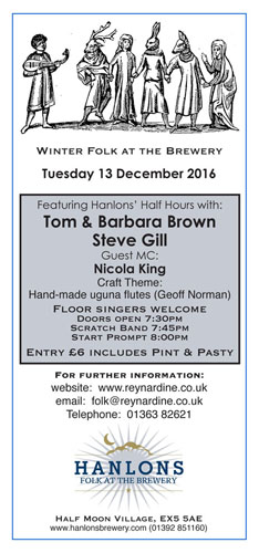 Tom & Barbara Brown have been singing together since 1969. They specialise in songs of the West Country, but their repertoire covers a huge range of traditional and some modern material. Tom plays guitar, mandola, concertina and melodeon, and is also a caller. They run Shammick Acoustic in Combe Martin and are involved in numerous other local folk projects – mummers, shanties, CDs, workshops, Moor Music, the Devonshire Association, etc. They had to cancel most of their gigs in 2016 due to illness, so we were delighted they were able to perform at Hanlons and wish them a healthy 2017. | 'November Drinking Song' 'Young Girl Cut Down in Her Prime' 'Two Brethren' 'A Minehead Lad' 'The Christmas Hare' 'Tip O’ Derwent' 'Poison Beer' 'One and One' 'Sea Shorts Set' |