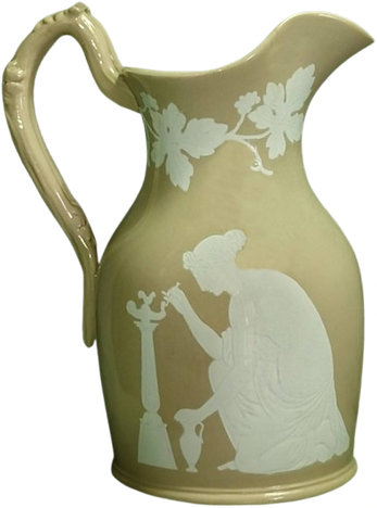 | 144 / 150 / 151 Mosaic (not titled) Design not published or registered. Jug with inlaid (mosaic) classical figures; not relief-moulded Marks: printed royal arms with "PATENT" Illustrations: Hughes 2/50 Model numbers: |