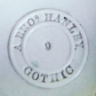 | "May" Design not registered. Marks: moulded circle mark "A. BROS HANLEY / MAY". Pattern numbers noted include B/1495. Illustrations: none |