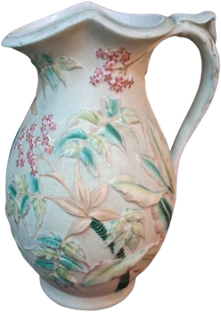 They produced a number of relief-moulded jugs from 1845 through to the mid-1850s. At least nine different jug designs are known and although the Mayers do not seem to have titled any of them, they did use a numbering system which covered most of them togther with related wares. The numbers appear as part of the marks and indicate not only the main design but also variations in colouring. Those recorded to date include: