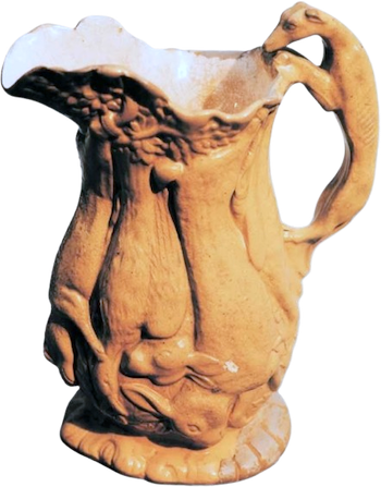 Hanging Game (not titled) Design not registered. This jug originated in Staffordshire and was made by the so-called Chrysanthemum Pottery amongst others. It was also reproduced in Bohemia. Marks: impressed "WILSON & PROUDMAN" on a moulded panel |