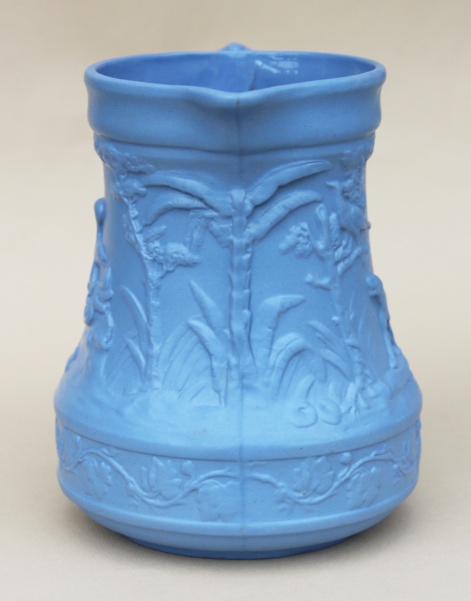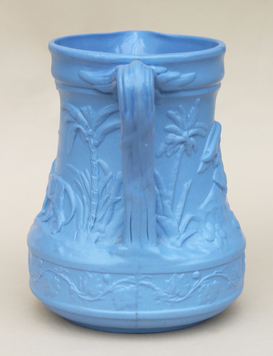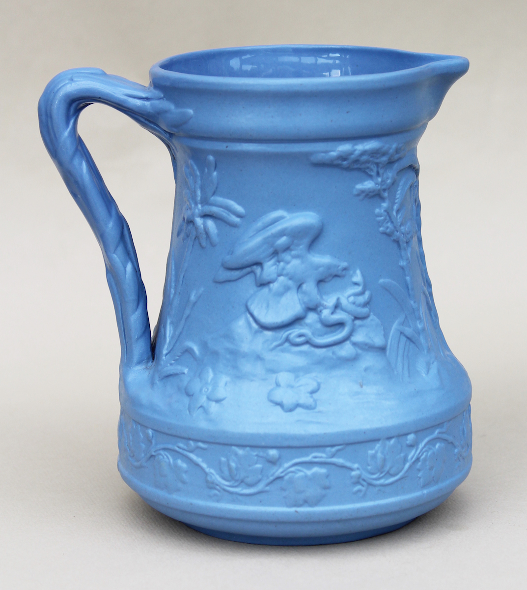 Aesop's Fables relief-moulded jug, in blue stoneware, moulded with two different fables, one showing the Eagle and the Serpent. Height 16.0 cm (6.3in). Unmarked. Good condition, no chips, cracks, or restoration. Price £45 (plus shipping: UK £7.50).