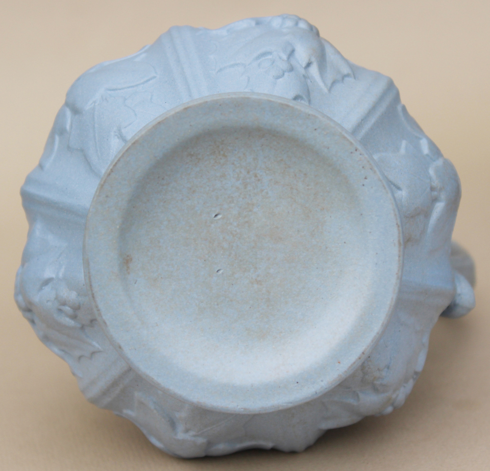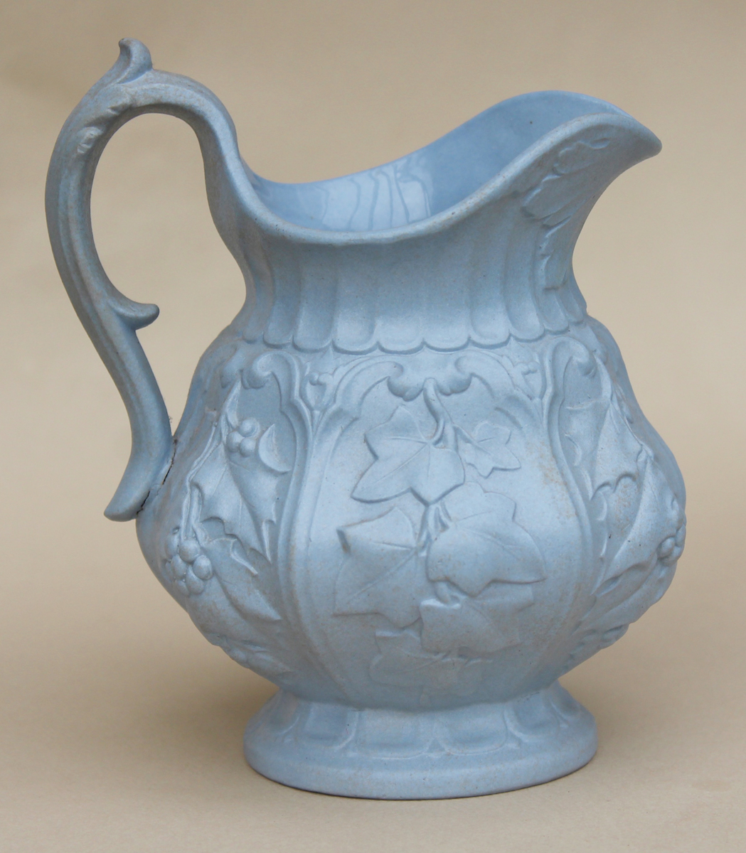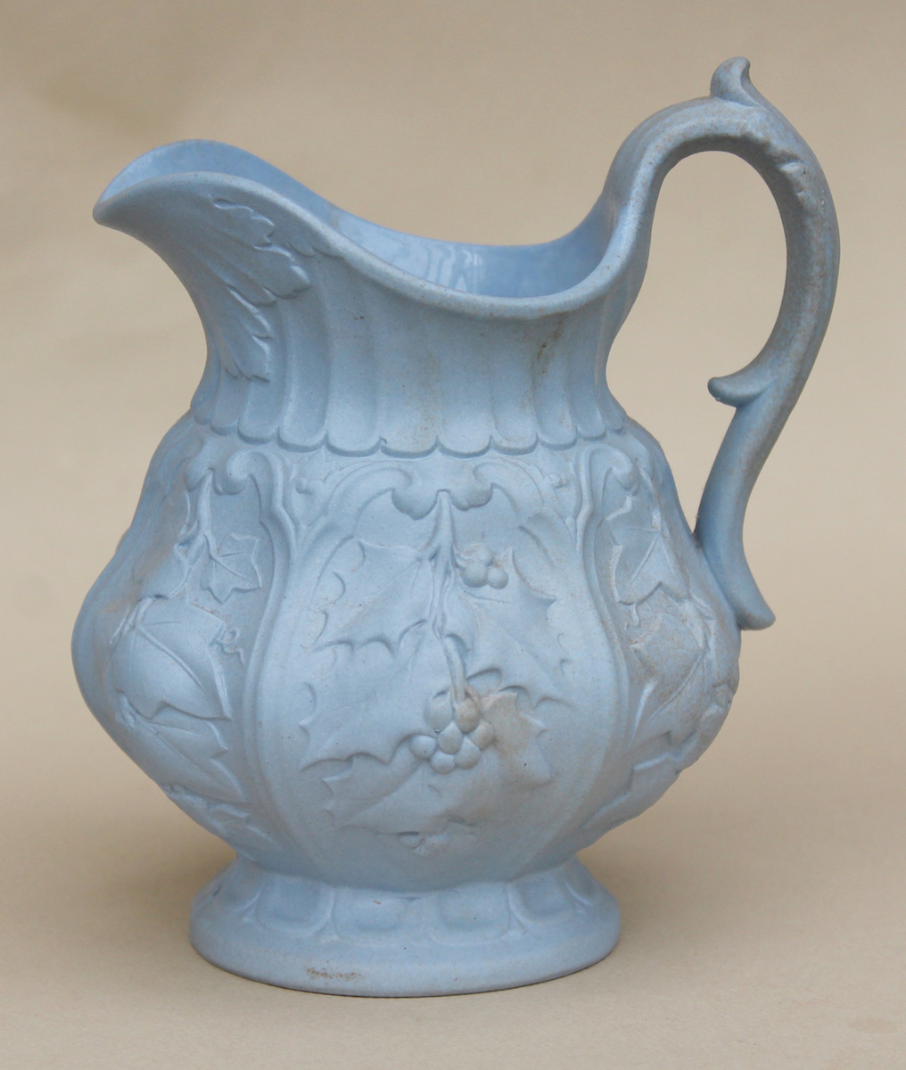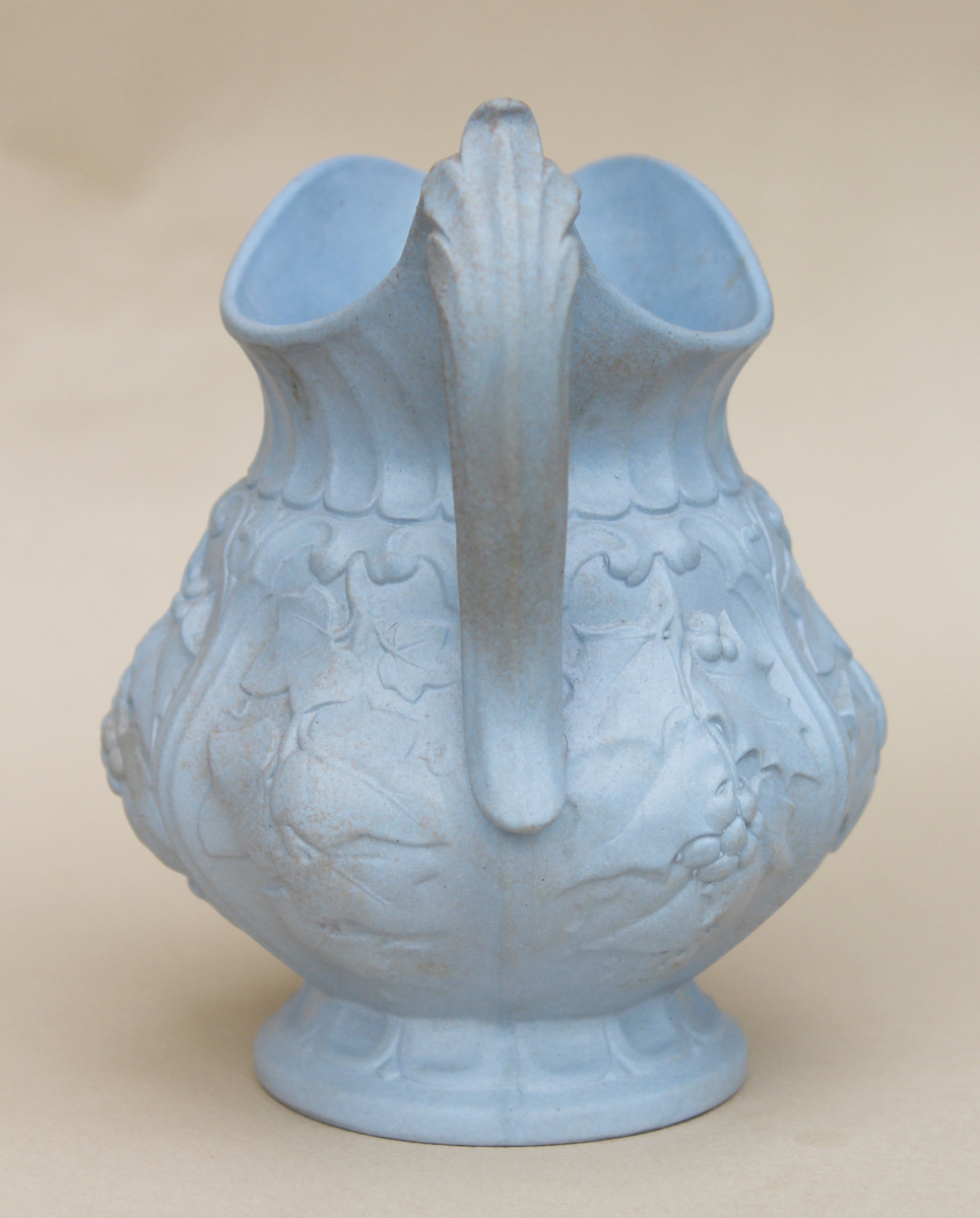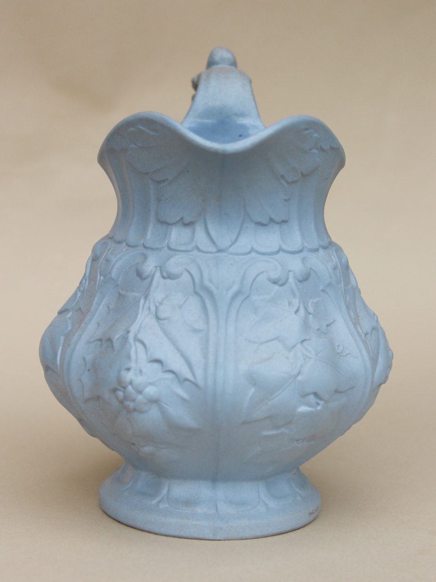 Holly and Ivy, a small blue stoneware jug moulded with alternating panels of holly and ivy. Height 13.5cm (5.3in). Unmarked. Good condition, no chips, cracks, or restoration. Price £35 (plus shipping: UK £7.50).
